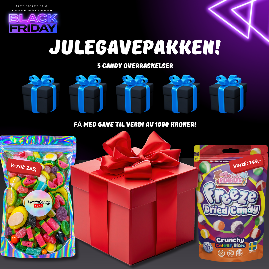 Gi bort en gave som virkelig skaper WOW-faktor! Julegavepakken er full av premium godteri, eksklusive overraskelser og en stor hovedgave som får både barn og voksne til å lyse opp. Dette er den perfekte pakken til familie, venner, kjæreste – eller deg selv.