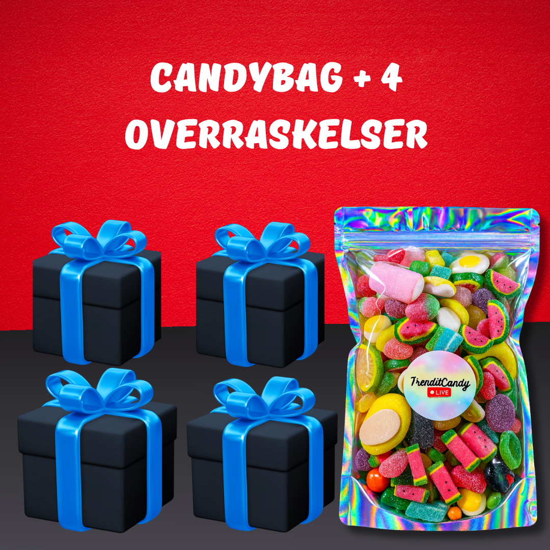 Gjør deg klar for den ultimate godteriopplevelsen! Med CandyBag + 4 Overraskelser får du en herlig miks av ferskt, innpakket godteri – perfekt både til hverdagskos og som en ekstra treat. I tillegg får du fire spennende overraskelser, som kan være alt fra eksklusive snacks til limited edition-godbiter.
